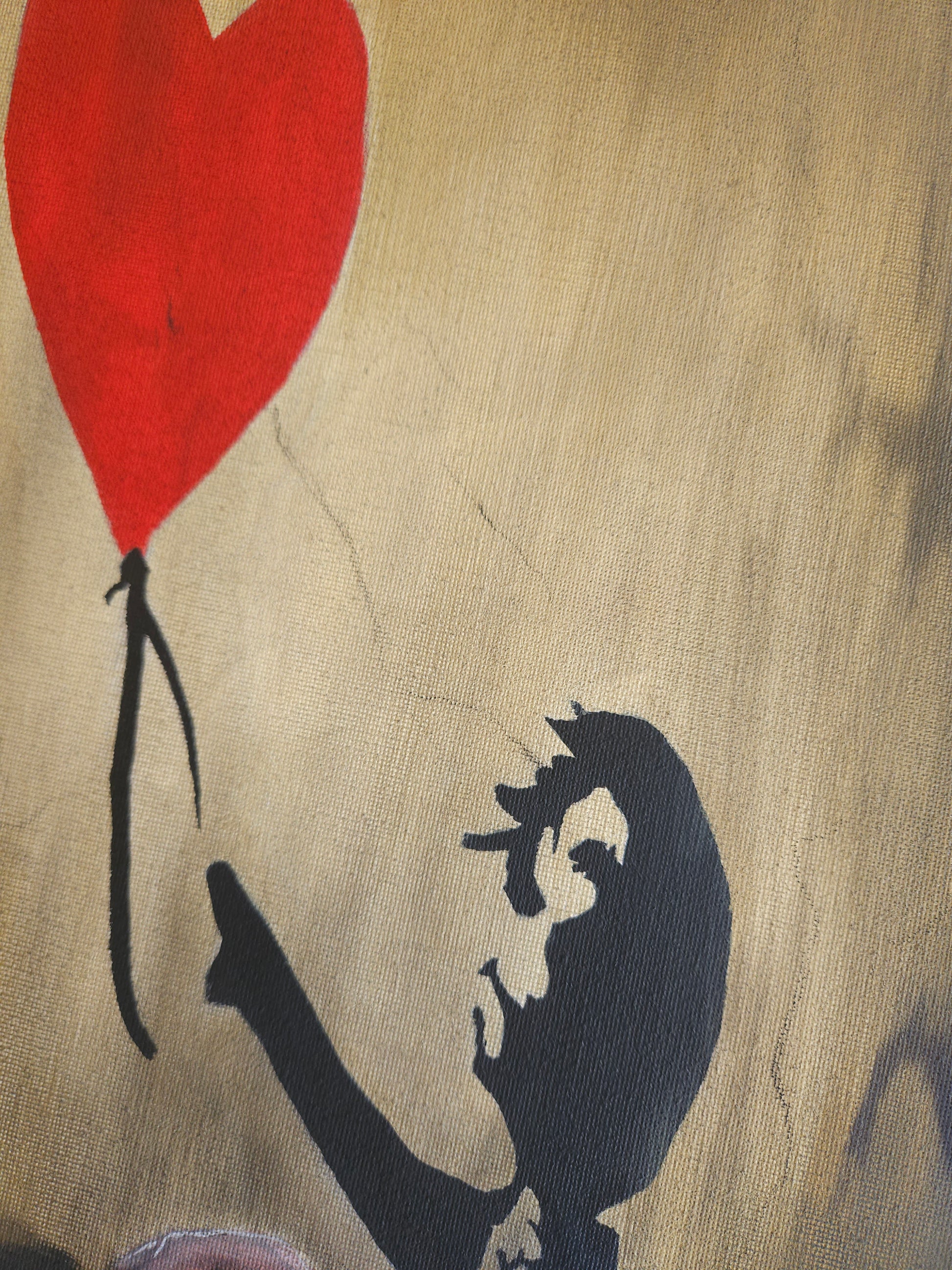 In this striking reimagining, Banksy is portrayed as an older man, weathered by time yet undimmed in spirit. Dressed in a bold red tracksuit, he kneels mid-act, spray can in hand, recreating one of his most iconic works — the girl with the red balloon. The piece celebrates the enduring fire of creativity, symbolising that true artists never retire; they simply evolve, carrying their passion through every stage of life.